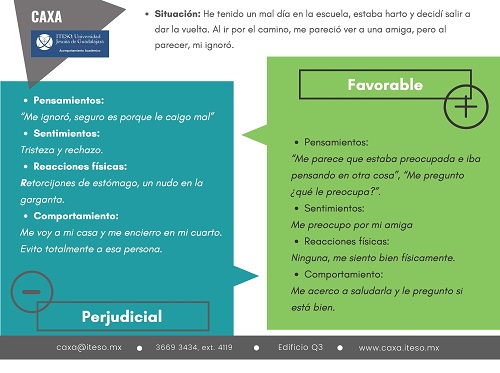 Si observas detenidamente tus respuestas de la columna de la izquierda, llegarás a conclusiones sin tener muchas pruebas de la situación; y esto importa mucho, ya que desencadena una serie de sentimientos incómodos y comportamientos que no solo te pueden perjudicar a ti, sino también a los que te rodean. Puedes llegar a cosas poco realistas sobre ti mismo, esto suele suceder cuando las emociones que percibimos son angustiantes, negativas e inquietantes, sobre de ellas tienes altas probabilidades de llegar a conclusiones e interpretar las cosas de manera extrema y negativa.