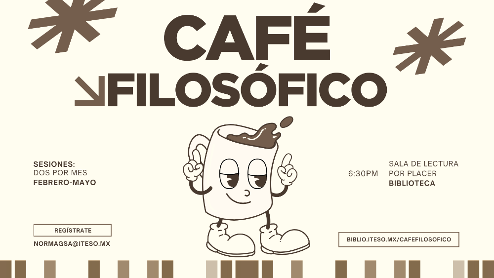 El Café Filosófico de la Biblioteca ITESO es un espacio de encuentro y diálogo en el que exploramos ideas desde distintas perspectivas. A través de conversaciones respetuosas y abiertas, buscamos cuestionar supuestos, ampliar nuestra capacidad de escucha y fortalecer la reflexión crítica. Cada sesión invita a problematizar temas cotidianos o conceptos que solemos dar por hechos, con el fin de enriquecer nuestra comprensión del mundo y desarrollar un pensamiento más profundo y constructivo.