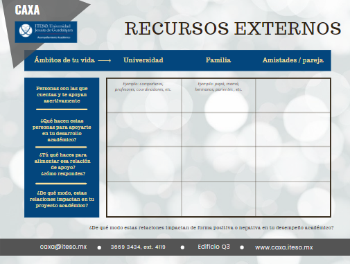 Es importante saber qué tienes, con quiénes cuentas y de dónde partes para poder desempeñarte de forma efectiva y armoniosa en tus proyectos. Ubicar con claridad estos recursos te apoyarán a enfocar tu energía, pensamientos, emociones, habilidades y capacidades para construir mejores estrategias a favor de tu desarrollo académico.
